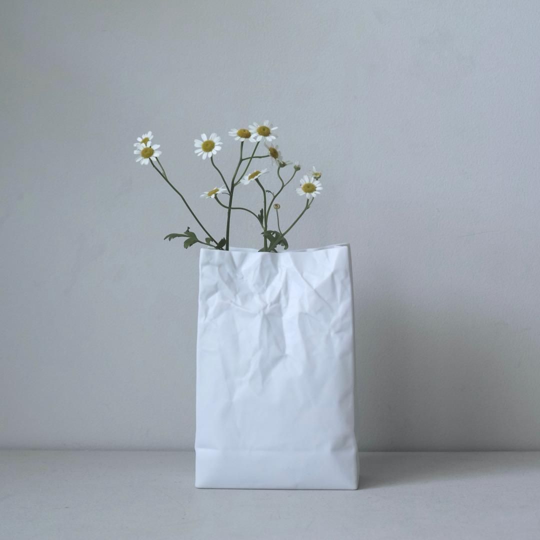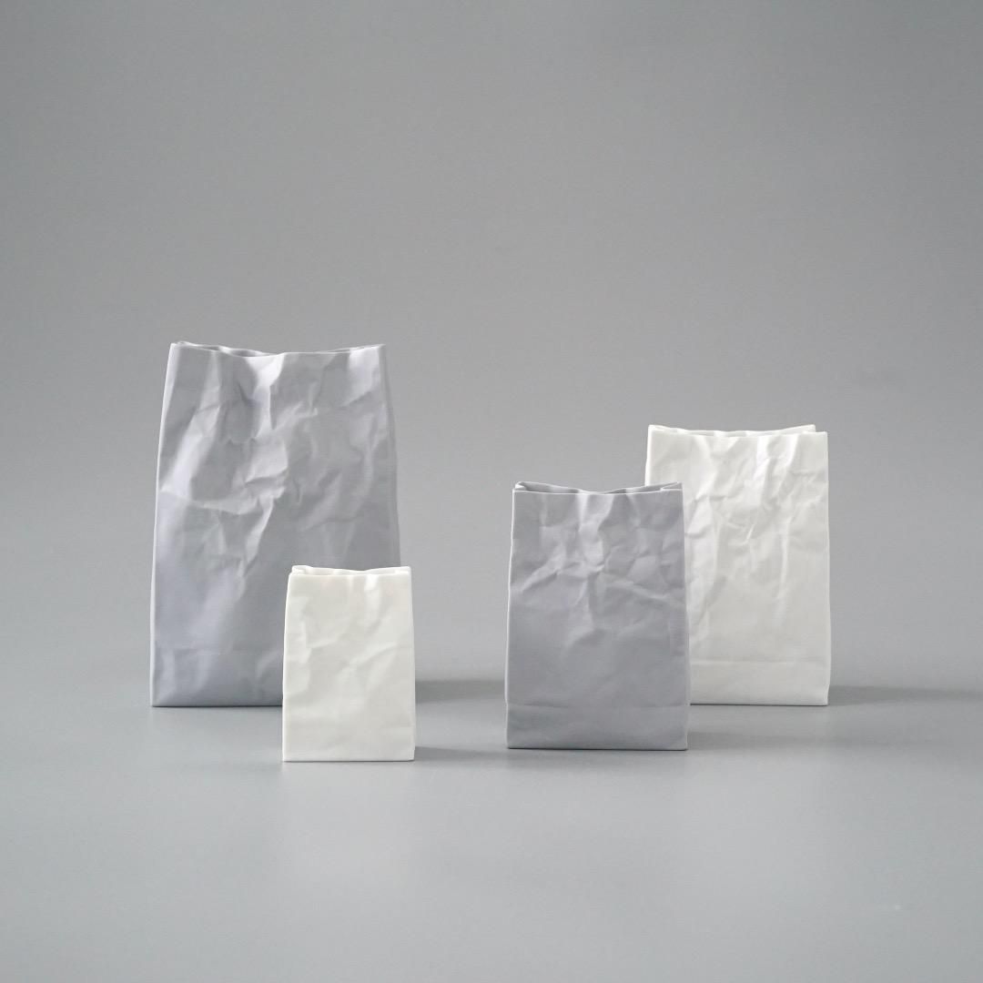 紙袋をそのまま陶磁器に仕立て上げたようなこの花器は、1300年の歴史を持つ焼物の街、愛知県瀬戶市にて作られ、職人の丁寧な鋳込み作業と仕上げによる精巧な佇まいが魅力です。